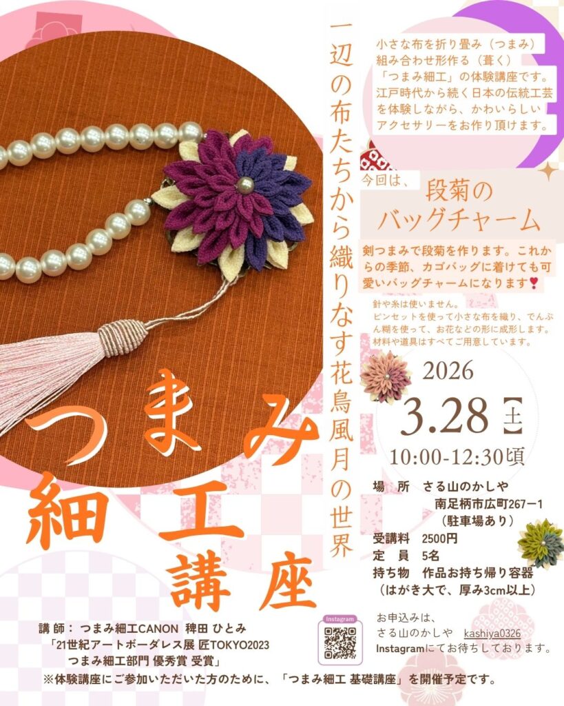【3/28(土)】つまみ細工ワークショップ 2026 3/26 イベント告知 2026年3月26日 3月28日のつまみ細工講座は、段菊のバッグチャーム! 剣つまみで段菊を作ります。これからの季節、カゴバッグに着けても可愛いバッグチャームに立てます。 ご予約はInstagram、公式ラインまたはこちらから。 イベント告知 よかったらシェアしてね! URLをコピーしました! URLをコピーしました! かしや5周年 関連記事 よもぎ蒸し 2026年2月24日 【3/7(土)】英国菓子と紅茶を楽しむ会 2026年2月24日 【2/21(土)】つまみ細工ワークショップ 2026年2月16日 【3/15(日)】ちいさな本箱 出店者募集! 2026年2月13日 【3/14(土)】ありがとさんマルシェ 出店者募集! 2026年2月13日 【2/8(日)】小さな占いの部屋×かしやカフェのお知らせ 2026年1月30日 【1/23(土)】つまみ細工ワークショップ 2026年1月23日 【12/7(日)】第2回ありがとさんマルシェを開催します!! 2025年11月20日 コメント コメントする コメントをキャンセルコメント ※ 名前 ※ メール ※ サイト 次回のコメントで使用するためブラウザーに自分の名前、メールアドレス、サイトを保存する。