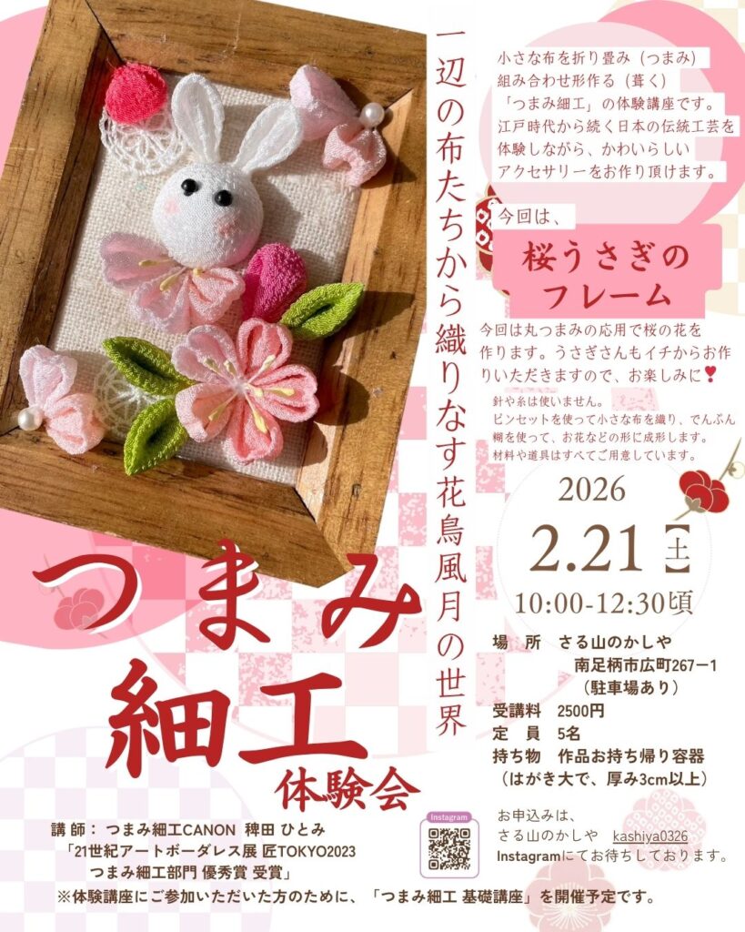 2月21日(土)10時から「つまみ細工の体験会」があります。